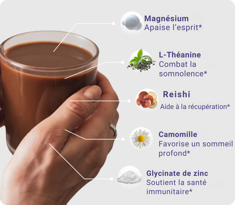 Notre produit vous aide à obtenir le meilleur sommeil de votre vie. Il contient un mélange sûr et puissant de superaliments et de compléments à base de plantes conçus pour vous aider à vous détendre avant le coucher, mieux dormir, augmenter vos cycles REM et vous réveiller rafraîchi. Nous travaillons avec un conseil consultatif médical indépendant pour garantir les plus hauts standards de sécurité et d'efficacité. De plus, c'est incroyablement délicieux et fait partie d'un rituel nocturne décadent.