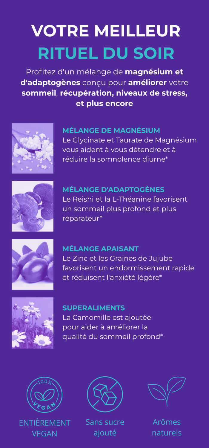 Bien que la mélatonine soit généralement considérée comme sûre pour une utilisation à court terme, la recherche sur sa sécurité à long terme est limitée. Notre aide au sommeil sans mélatonine à base de magnésium signifie que vous pouvez savourer notre produit chaque soir et vous réveiller sans somnolence matinale.
